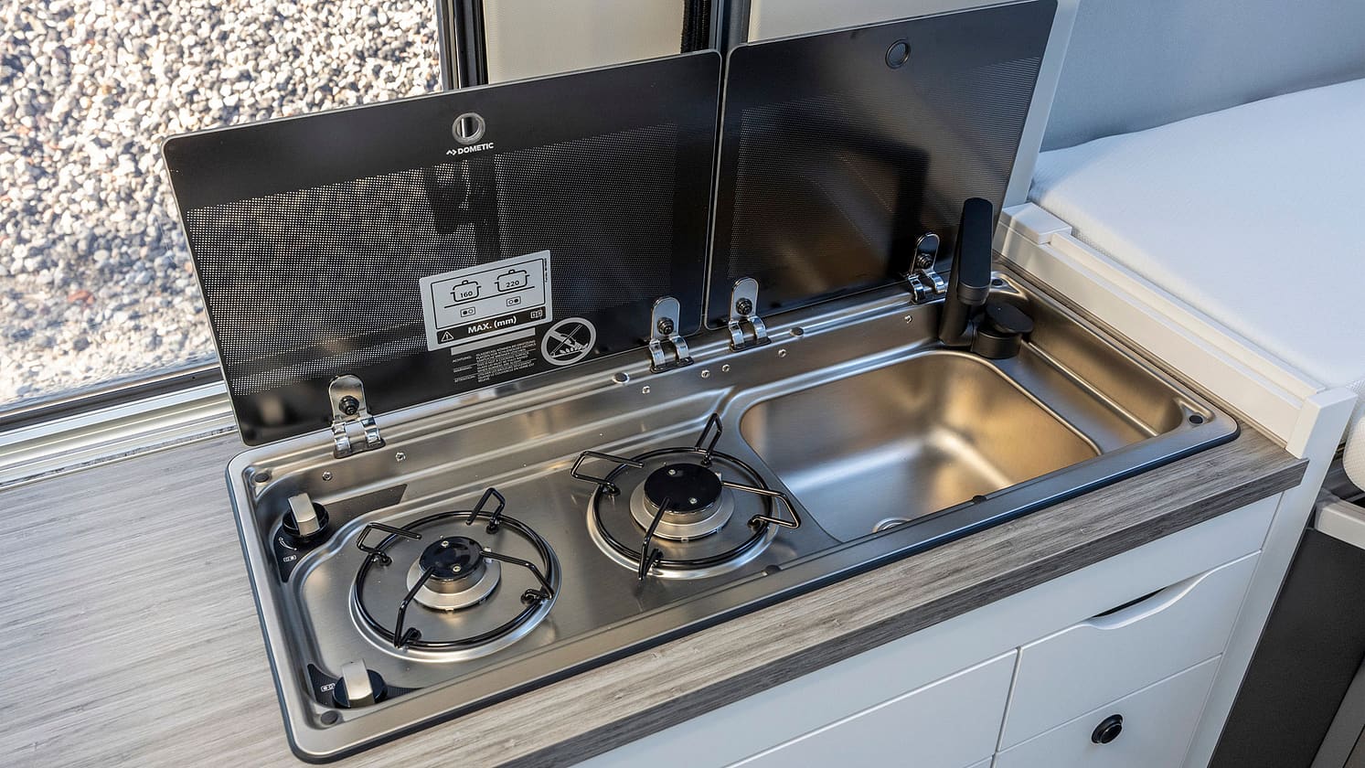 - Küchenzeile mit 2 Gasflammen, Spüle und Kühl- /Gefrierschrank
